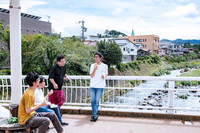 天気がいい日は、オフィスから出てすぐの橋のベンチで皆とお昼を食べることもあります。